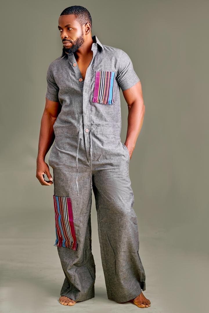 Gray linen jumpsuit detailed with Aso Oke